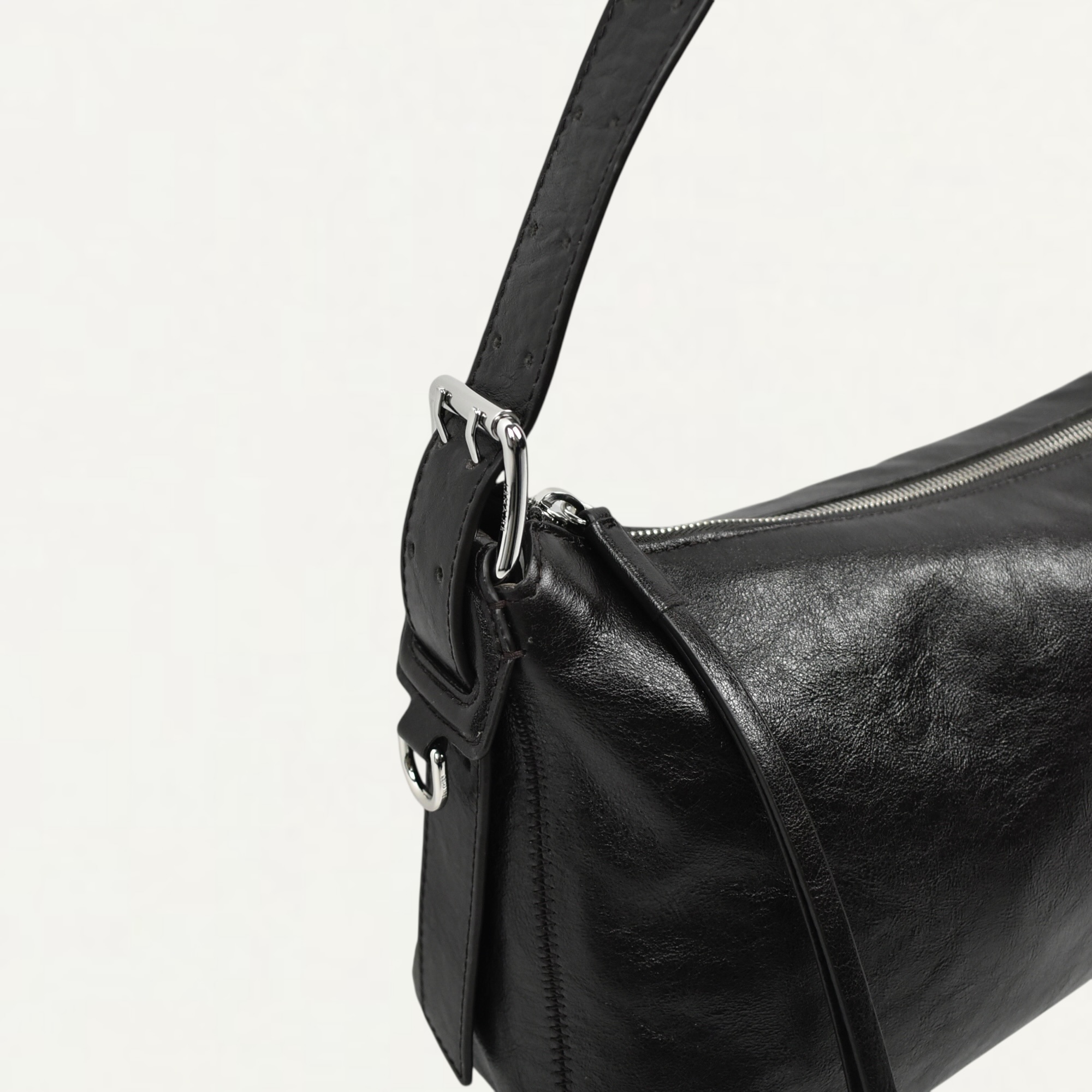 ・ベルト着想のベジタブルタンニンレザーストラップと 光沢のあるメタルパーツのコントラストが特徴のBeltedライン バゲットバッグ