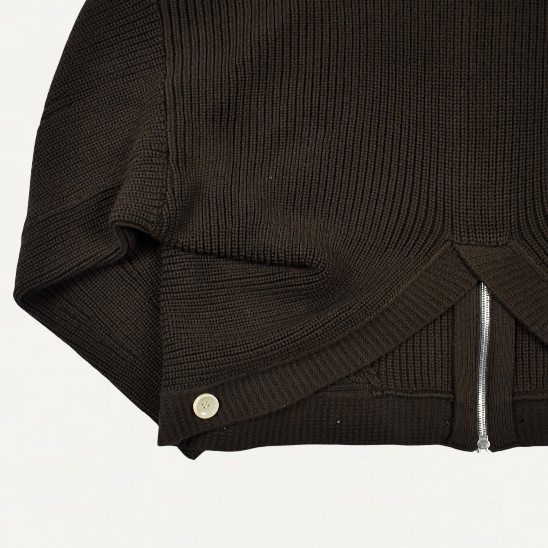 ・ローゲージの片畦編み ニットらしさを強調した編み釦ホールがポイント
