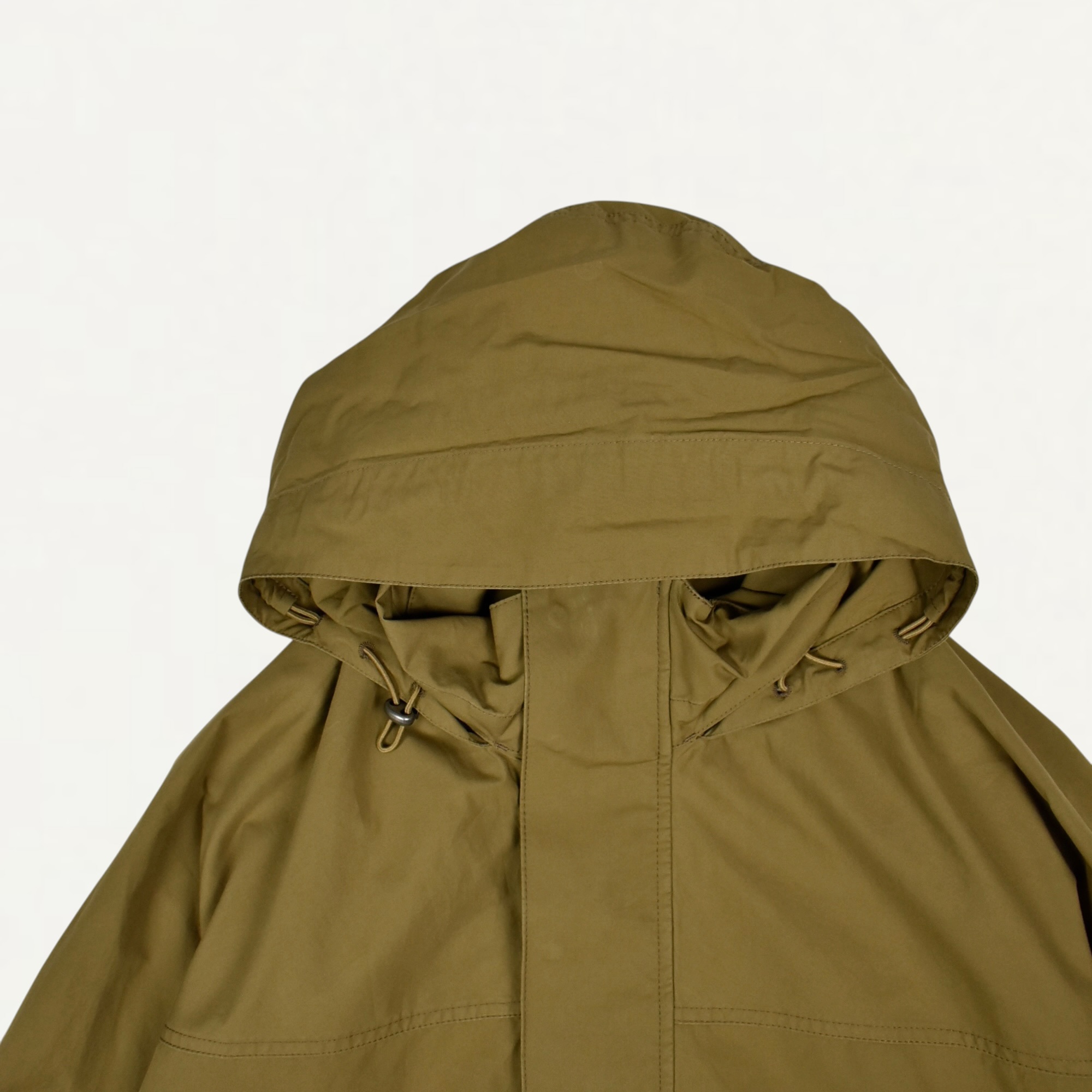 ・フード付きのアンライニング仕様、ドローコード付きハイネック